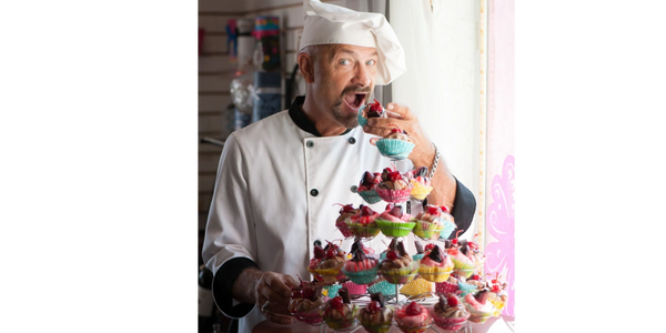 We start with a peanut butter chocolate cake, drench with a maple~peanut butter glaze. Garnish with chocolate kisses, peanut butter cups, marshmallows & maple leaves. We finish with a cherry, then drizzle with chocolate & peanut butter glaze